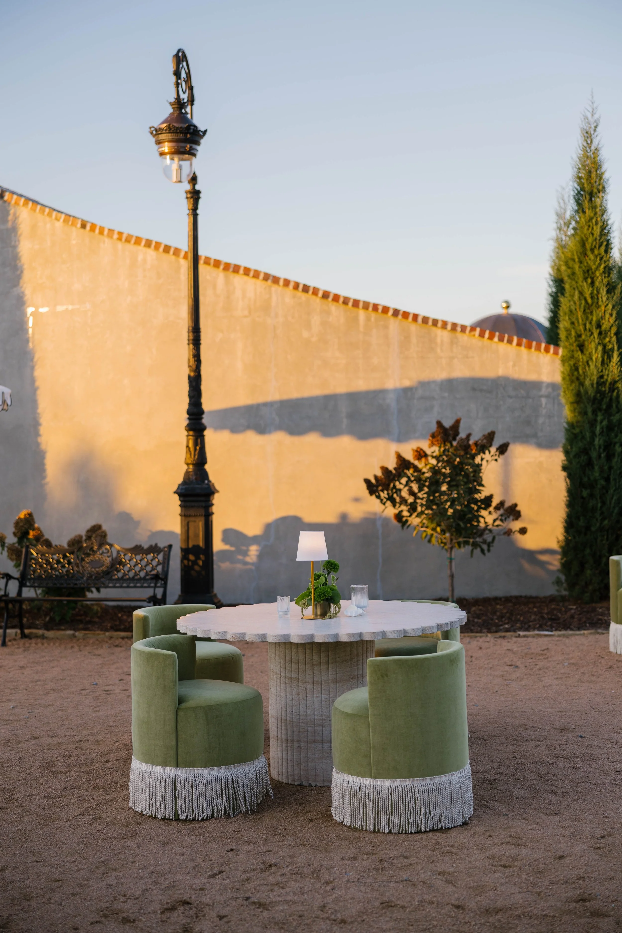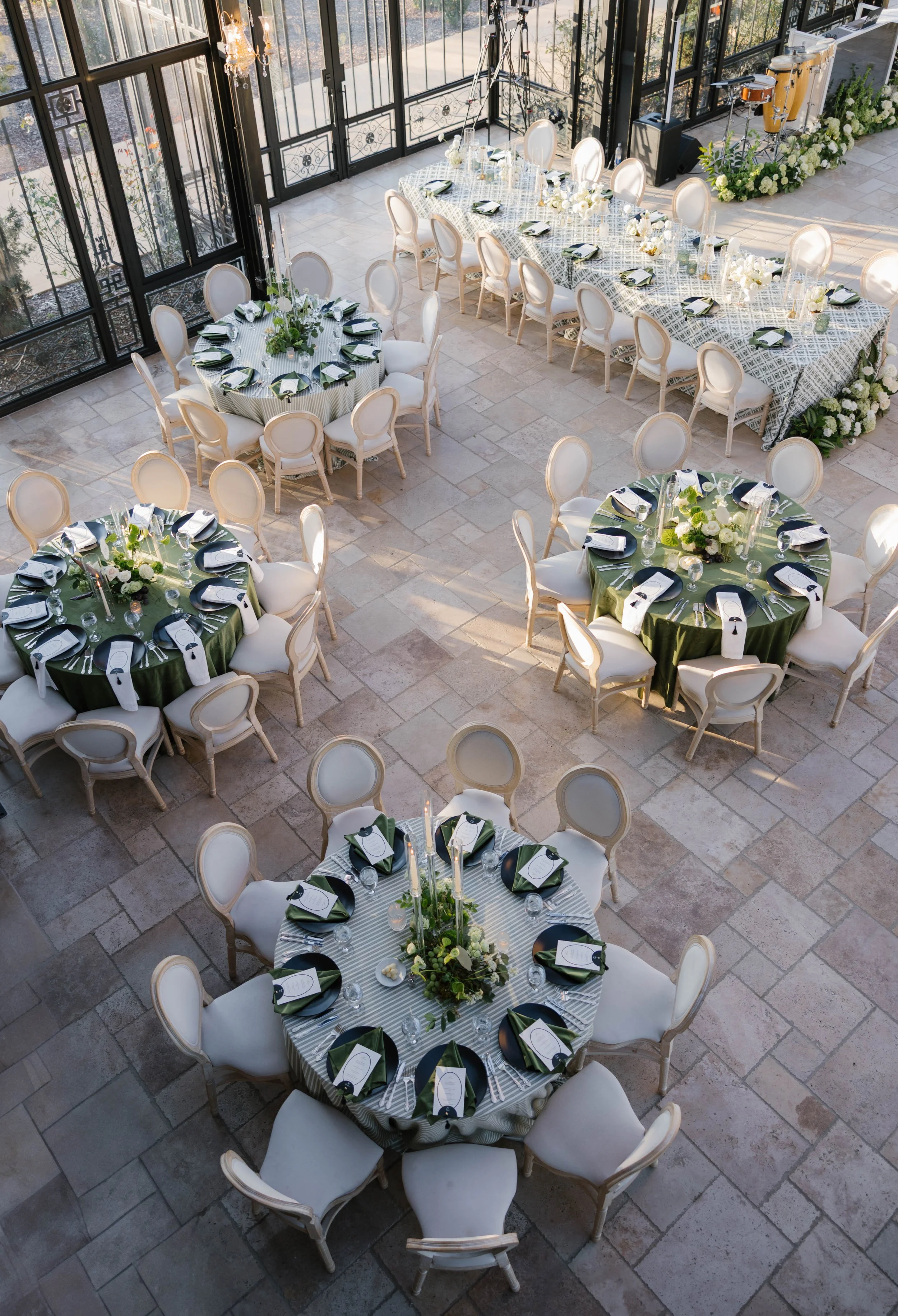 Proof you don’t need a passport for your wedding to feel effortlessly European. Each detail from the custom fabricated pieces to the napkins on the table worked in harmony with the black frame structure of the conservatory at Blackberry Ridge to create a day that was unforgettable. Our bar back shelves made a statement with the addition of custom striped awnings. Our Opal chairs provided a dining lounge area during cocktail hour and guests were welcomed to their table from a custom seating chart featuring our gold pleated sconces. Brianna and Quinn’s day was truly one for the books!