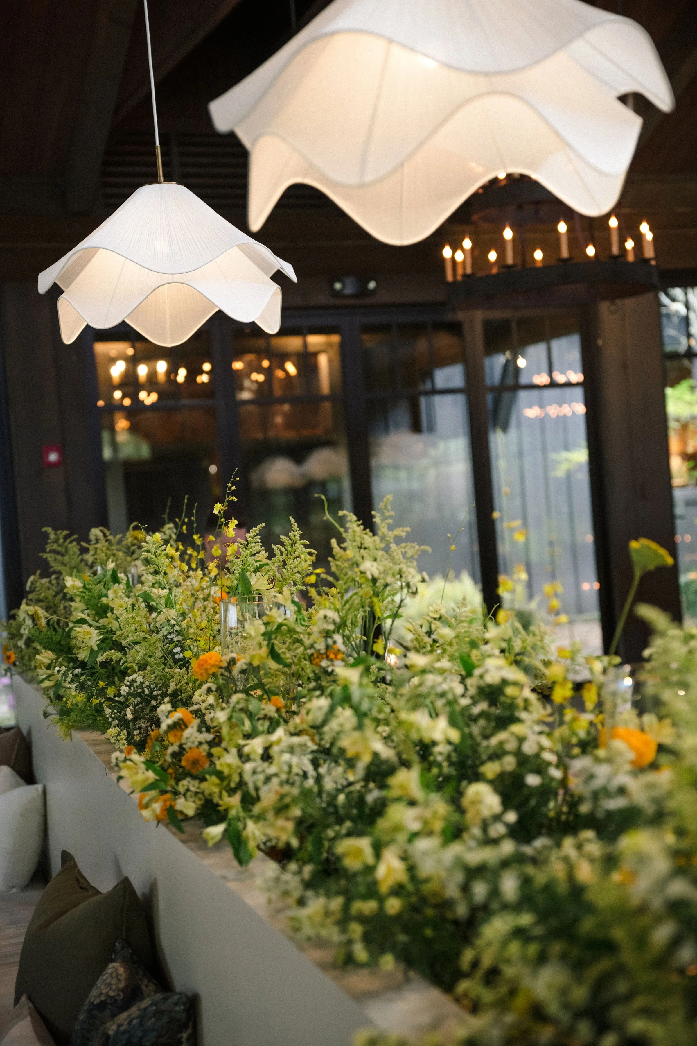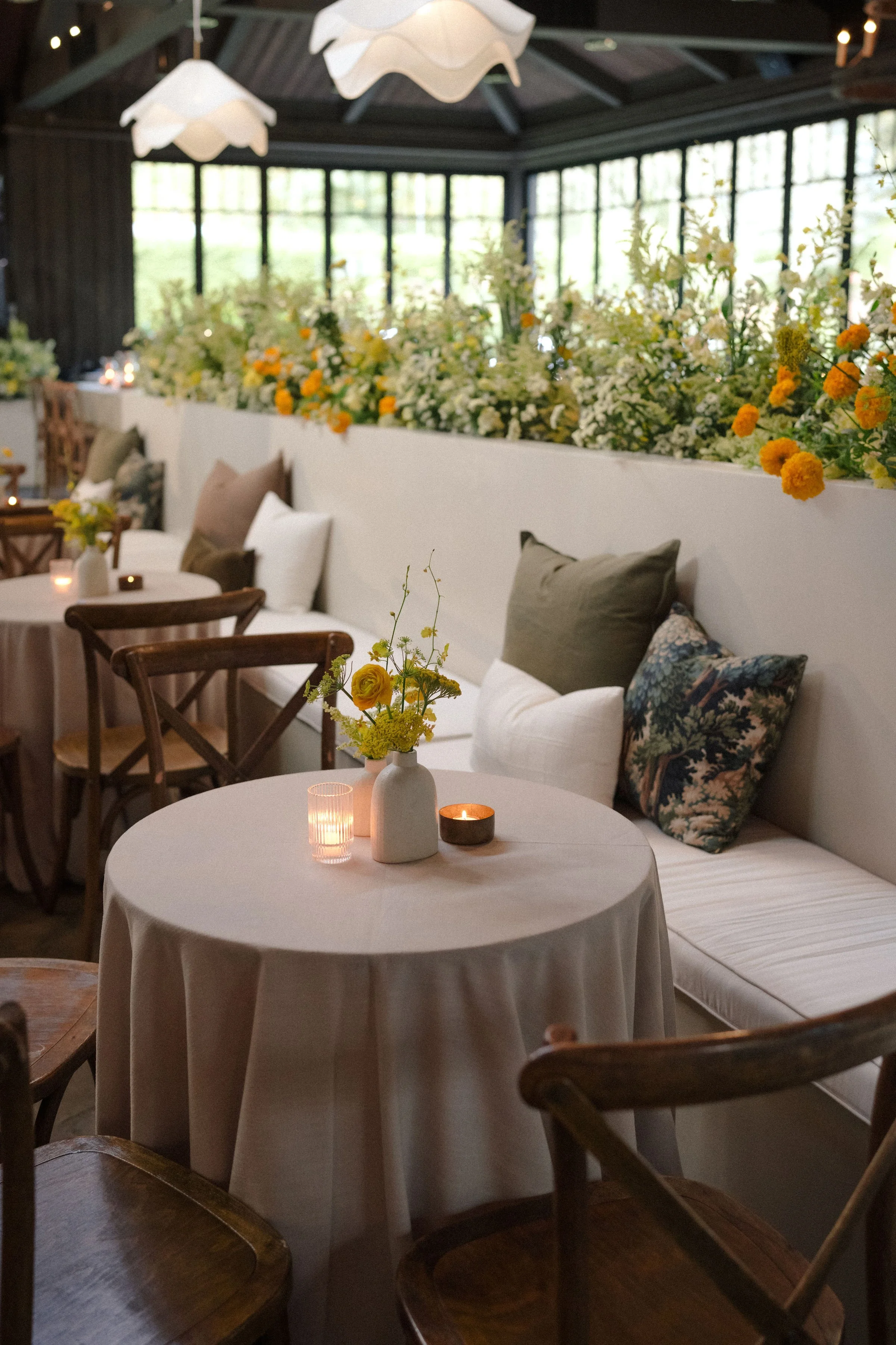 Sarah and Jack’s day was the closest thing you can get to perfect. From the top tier fall weather to the smallest detail of their reception, everything worked in tandem to create their day. Our custom fabricated 8’ banquettes ran back-to-back down the center of the room to create a space that felt unique and tailored. The pendant lighting we utilized added warmth and ambiance where needed. Our lounges utilized in the front room and breezeways created quieter spaces to step away from the dance floor or even enjoy a cigar. Each piece used intentional and impactful.
